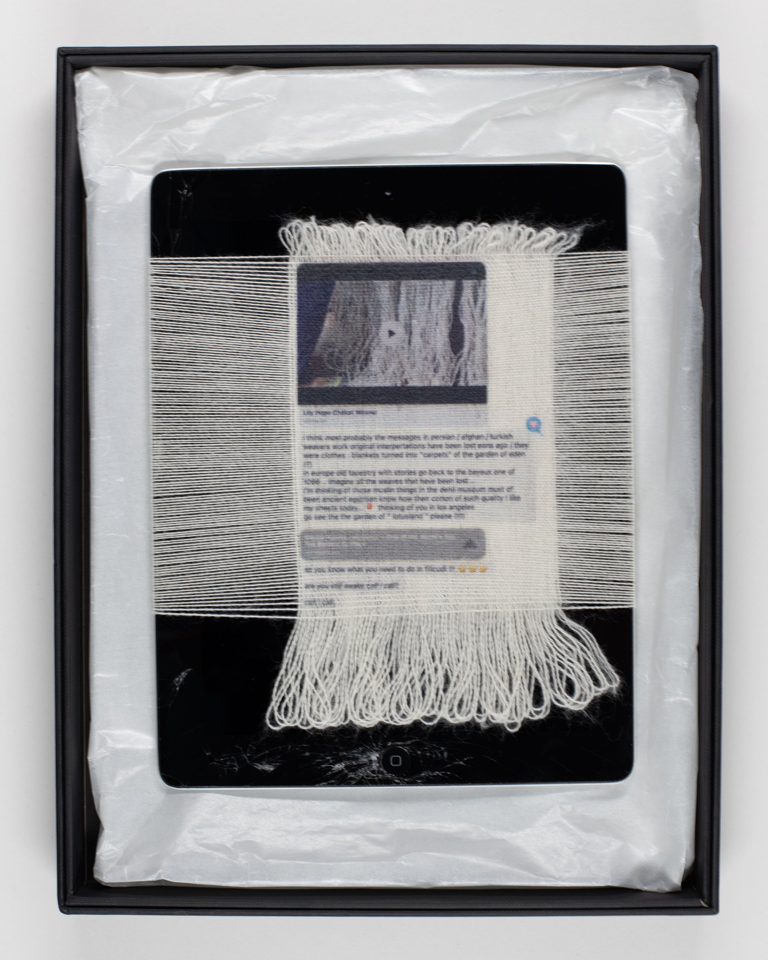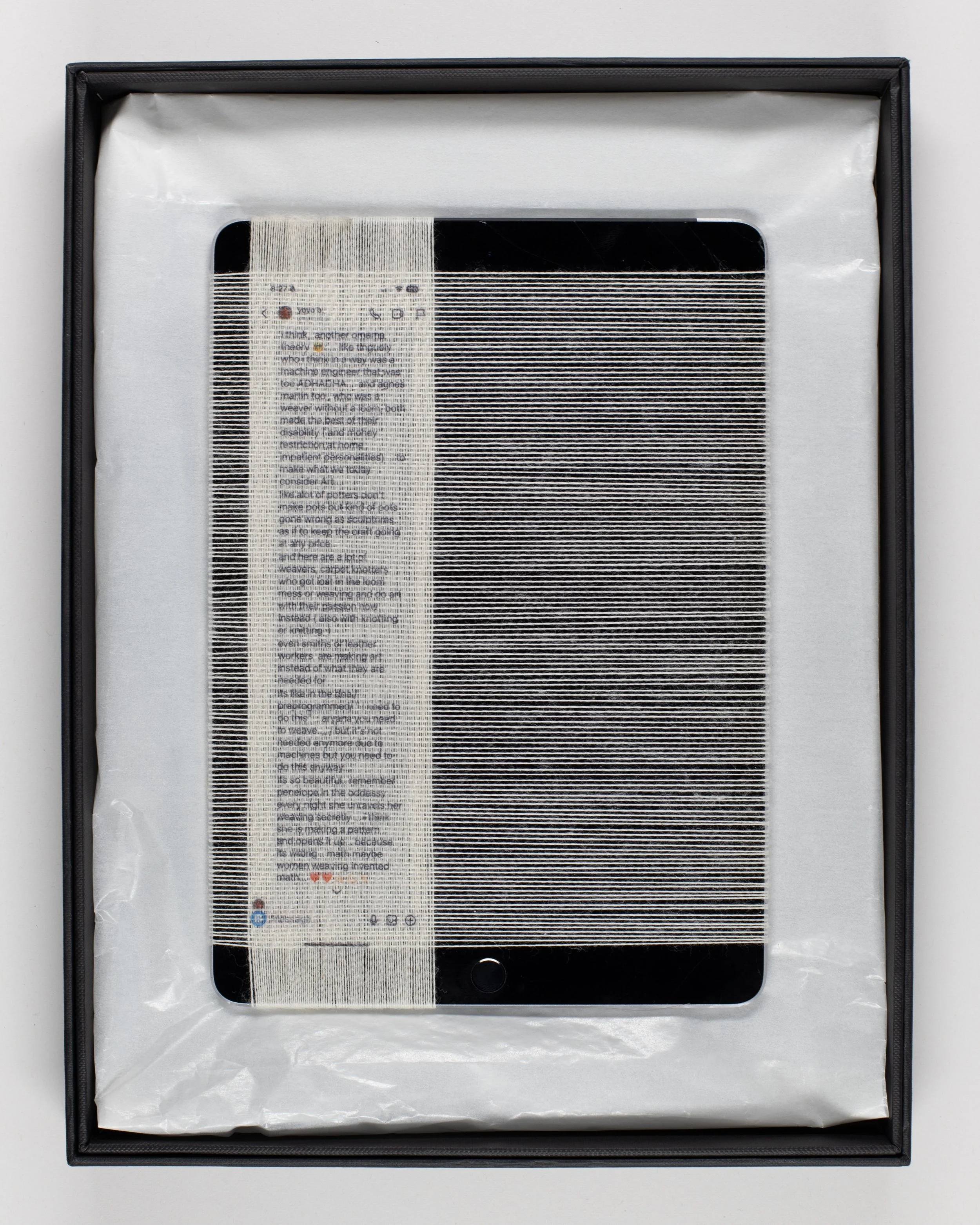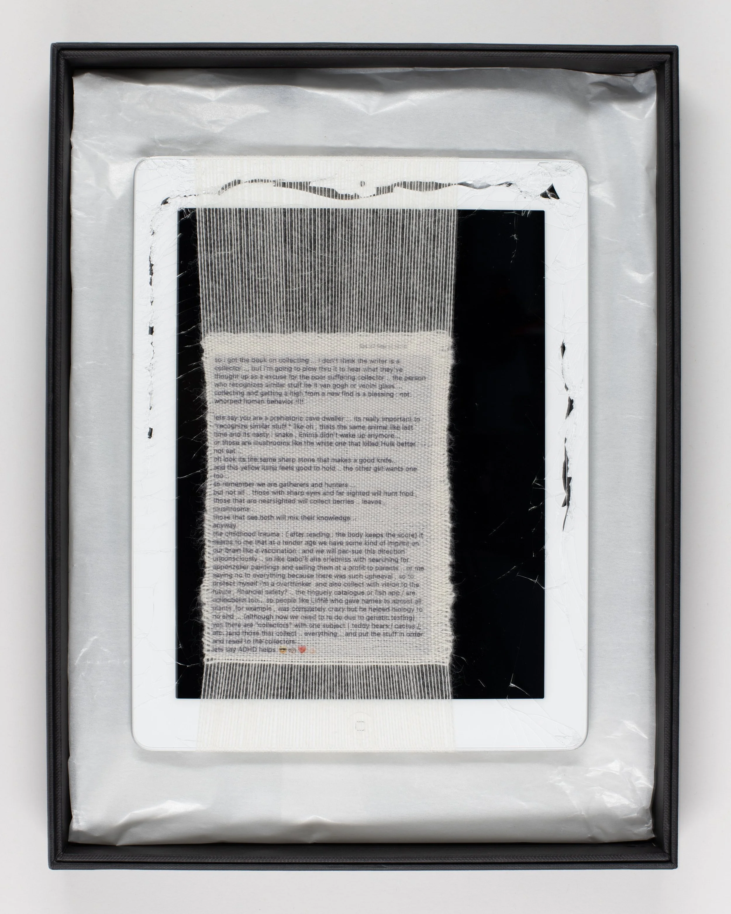 The iPads in particular function as an homage to the artist’s grandmother, whose text messages are ‘weaved’ into this body of work. Also called “tablets,” they evoke the transmission of ideas across generations, becoming artefacts to be looked at and cherished rather than used. This is reinforced by their method of display: exhibited in archival boxes, they elevate private thoughts into relics, preserving them as something precious and enduring. There is a quiet irony in a touch-screen device becoming an object forbidden to touch.