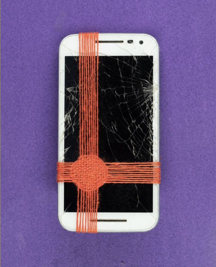 The cracks on the screens add another layer of history, hinting at their previous lives. In this way, the gadgets become fossils of our time, sanctified and frozen in place by the thread that surrounds them.