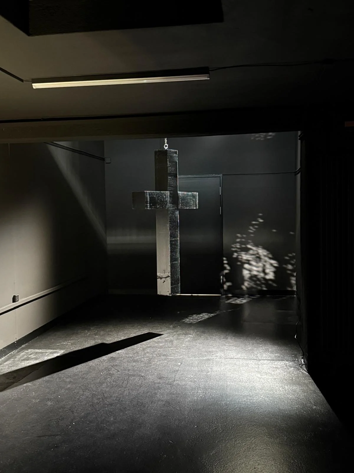 This sculpture fuses a crucifix with a disco ball, born from the artist’s realization on a dance floor that clubs and churches share striking similarities: DJs and priests, CDJs and altars, both generating a sense of collective ritual. The glittering object spins, demands attention, and reflects the viewer in its mirrored tiles, flattering our ego all while pointing toward deeper questions of meaning. Here, the sacred and the profane meet, suggesting that both nightlife and religion serve, in different ways, as spaces where people seek transcendence, acceptance and community.