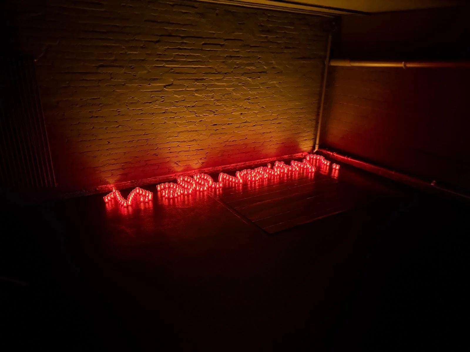 Formed by LED votive candles spelling the titular question in the artist’s childhood handwriting, this work draws on a devotional object traditionally found in churches and cemeteries. The flickering sentence is both innocent and urgent, bridging childhood curiosity with adult awareness of societal and artistic systems. As the LED lights dim and expire, temporality and impermanence are built into the work itself. By replacing wax candles with their modern, synthetic counterparts, Dupraz Nayak situates the piece in the present while asking timeless questions about finality and the absurdity of human ambition.